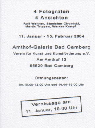 4 Fotografen 4 Ansichten Rolf Walther, Stanislaw Chomicki Martin Trippen, Werner Kumpf 11.Januar - 15.Februar 2004 Amthof-Galerie Bad Camberg