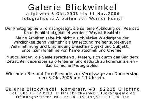 Galerie Blickwinkel zeigt vom 6. Okt. 2006 bis 11.Nov. 2006 fotografische Arbeiten von Werner Kumpf